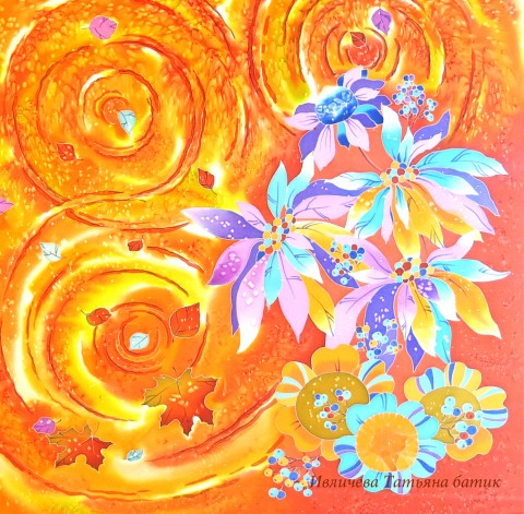 Яркий сочный цвет платка с солнышком внутри переливающийся на свету золотыми, оранжевыми, терракотовыми цветами - это основной фон платка.